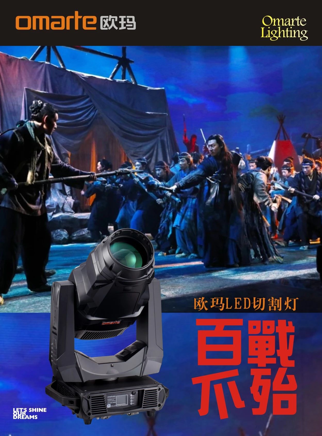 本次《劉永福·英雄夢》現場采用了歐瑪燈光1500W染色燈OA3500WASH、1500W圖案燈PRA15+、電腦搖頭光束燈MOORE260等系列燈具,歐瑪燈具穩定的性能、優秀的品質保證了本場劇目完整呈現,完美的燈光效果得到廣大觀眾的點贊。