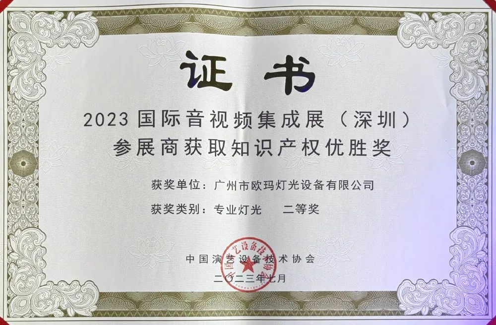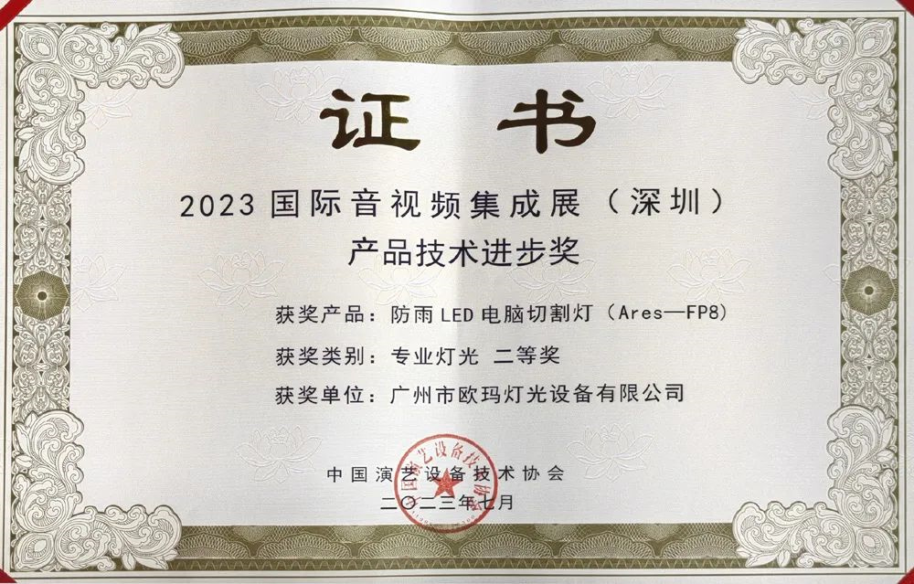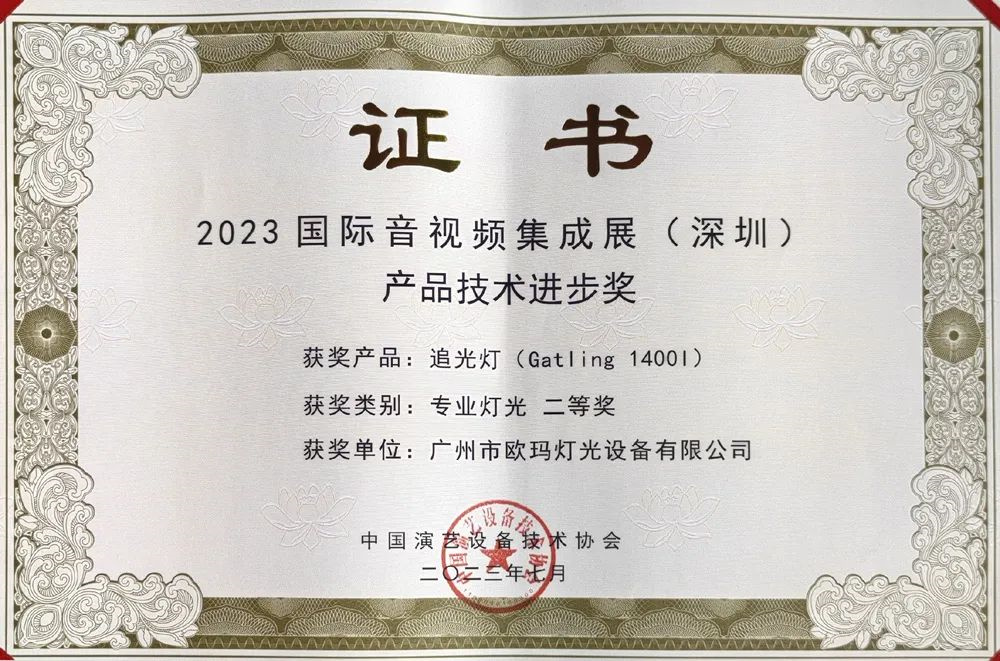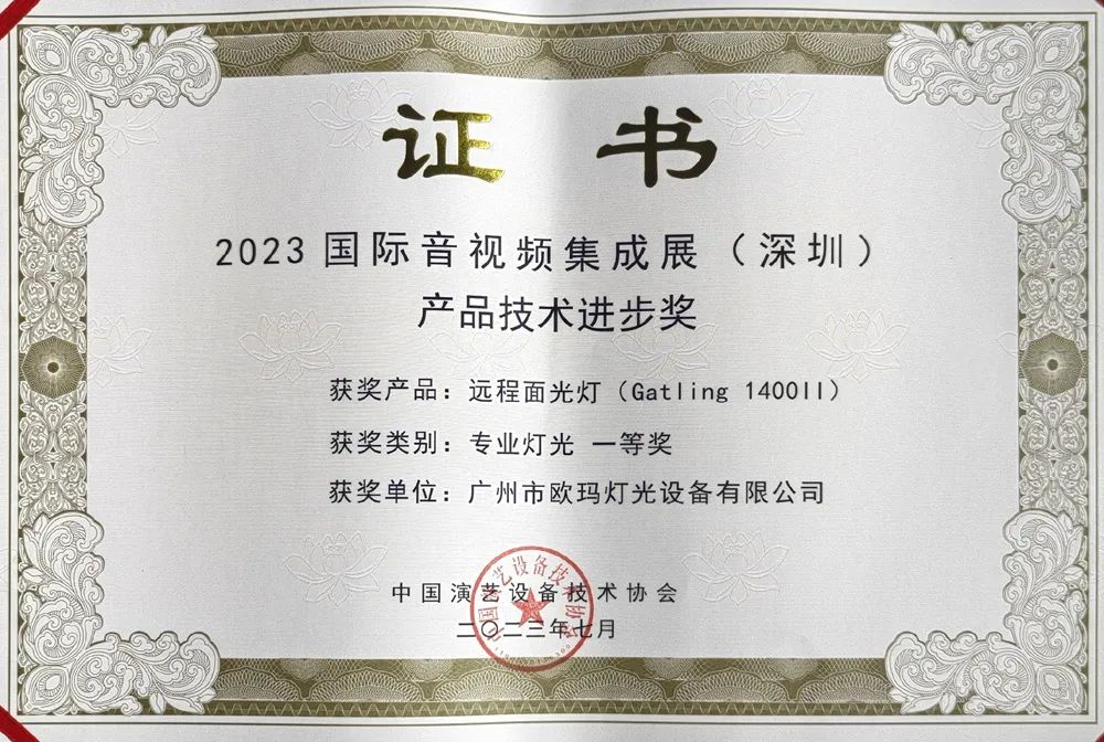 歐瑪燈光遠程面光燈(GATLING 1400II)和車展燈(EOS-CZ700)評為“產品技術進步獎--專業燈光一等獎”