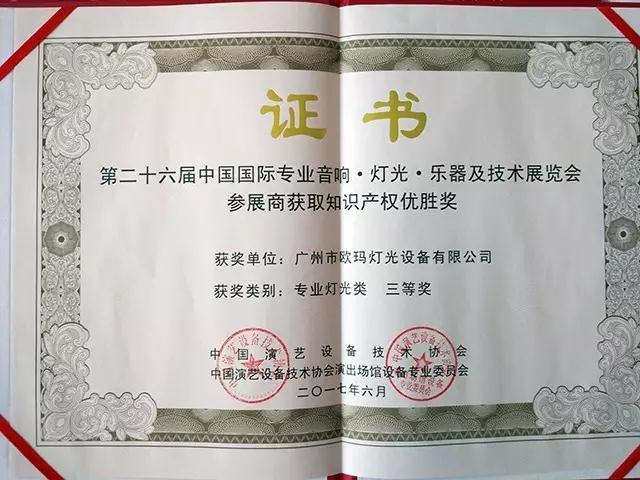 歐瑪燈光榮獲“產品技術進步一等獎”、“產品技術進步二等獎”、“知識產權優勝三等獎”三項大獎,這是繼2013、2014、2015、2016年連續獲的PLAM展參展商獲取知識產權優勝獎后,2017年Omarten歐瑪燈光再次獲獎,成為連續五年獲此殊榮的參展商,真是可喜可賀!