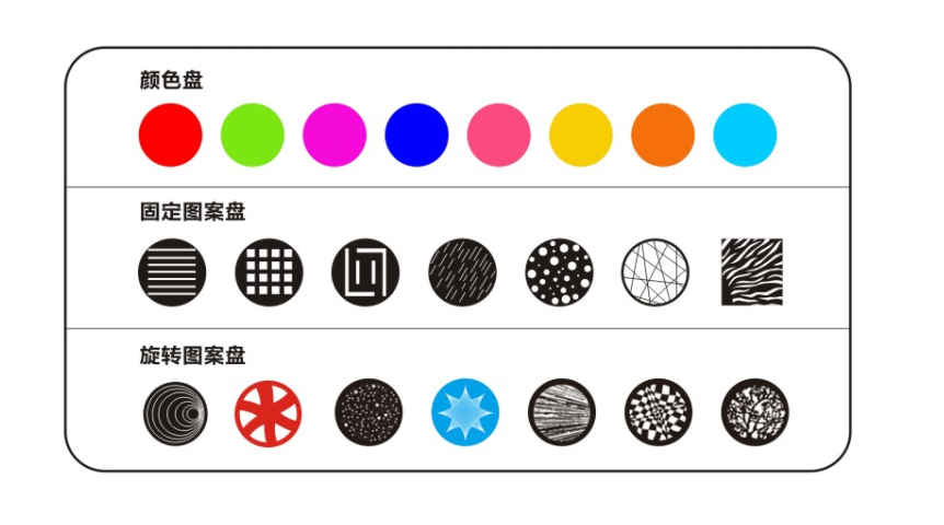 · 1個固定圖案盤:6個金屬圖案+一段局部動感紋理+空白;帶圖案抖動功能